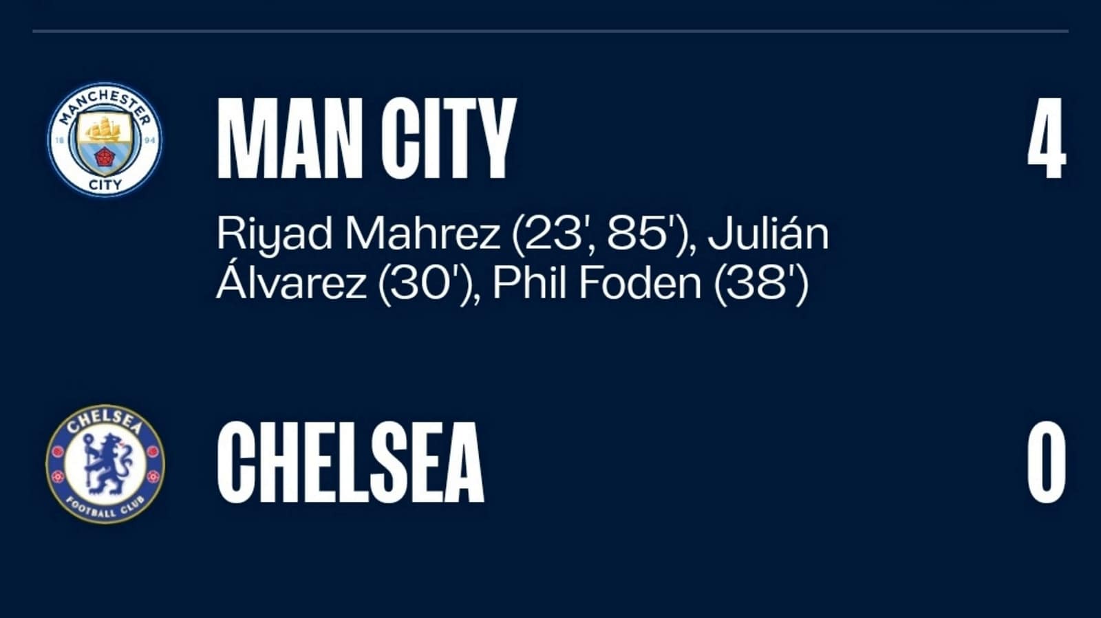 Матч 1/16 Кубка Англии по футболу на стадионе Этихад завершается со счетом 4:0 в пользу Манчестер Сити. Голы на счету Рияда Мареза (23, 85), Хулиана Альвареса (30) и Фила Фодена (38).